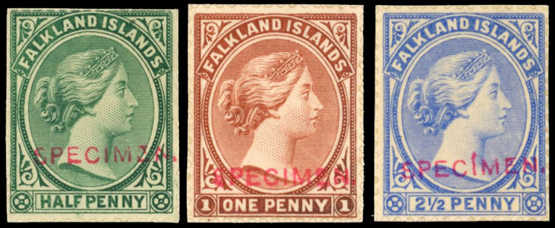 (-1902) ½d blue-green, 1d orange red-brown, 2½d pale chalky ultramarine, from the Aug 1891 or Oct 1891 (1d) printings, each with red "SPECIMEN." handstamp (16.5 x 2mm), affixed to pieces as usual, from the BW archive sheets. An attractive "set", only