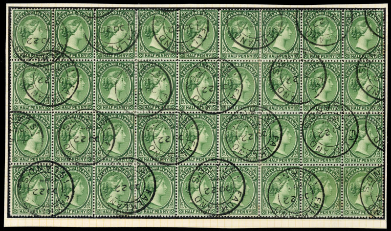1891-1902 ½d deep yellow-green, block of 36 (9 x 4), crisply cancelled by numerous strikes of type F2 cds dated ‘OC 22 1894’ (with month inverted). Some reinforcement and minor imperfections but a spectacular and attractive multiple