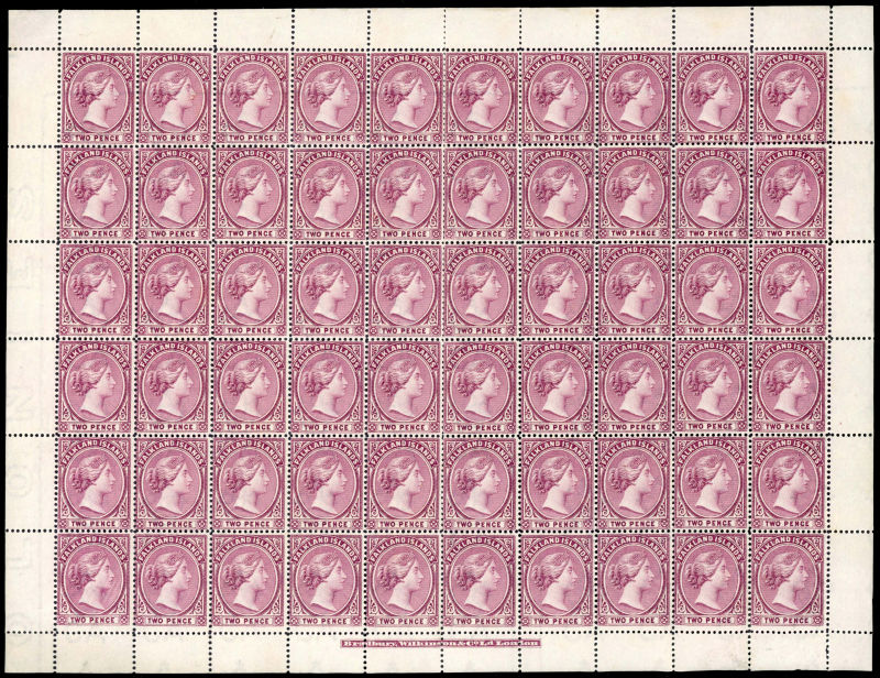 1891-1902 2d reddish purple, complete sheet of 60 with imprint at foot, superb unmounted o.g. SG 26, cat £540++ (Image)