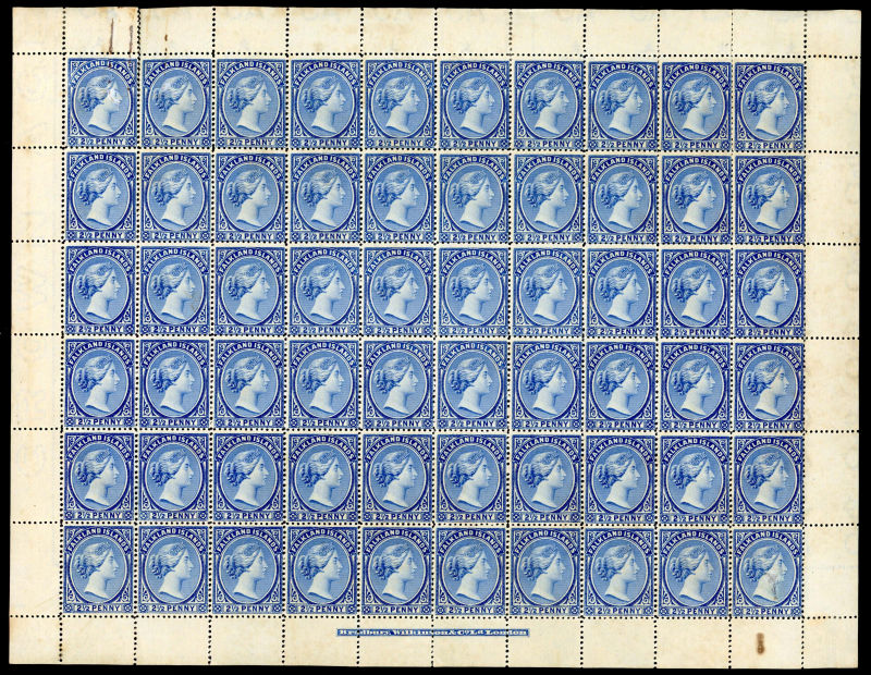 1891-1902 2½d deep ultramarine (18 Sep 1901 printing), complete sheet of 60 (6x10) with imprint at foot, o.g. (mounted on two stamps only). Stains affecting three stamps at NW and SE corners (caused by paper clip), and some split perfs,