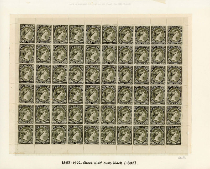 343   image1891-1902 4d olive-black, May 1895 printing, complete sheet of 60 (10x6), brilliant unmounted o.g. Position 20 showing minor variety ‘thorn on bust’. Wonderfully fresh  SG 32 cat £960+ (Image)