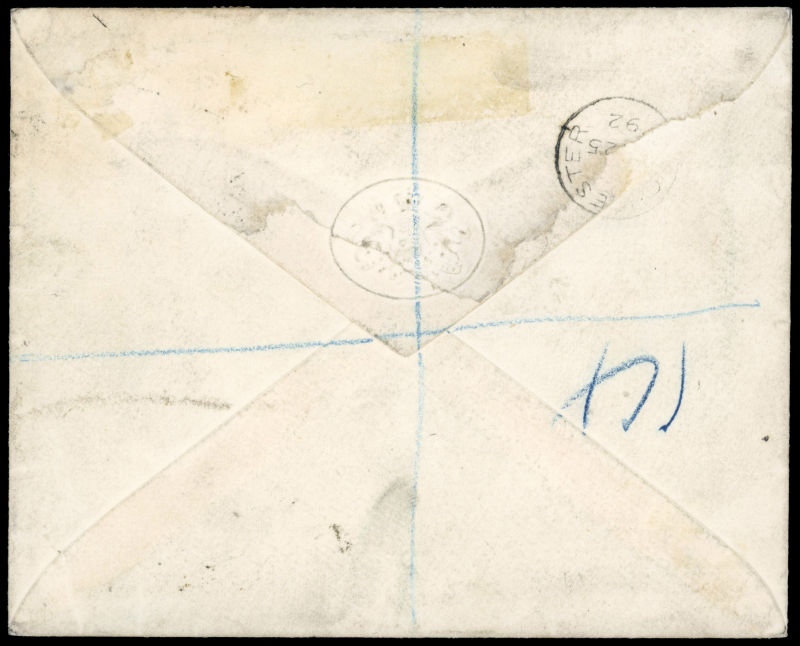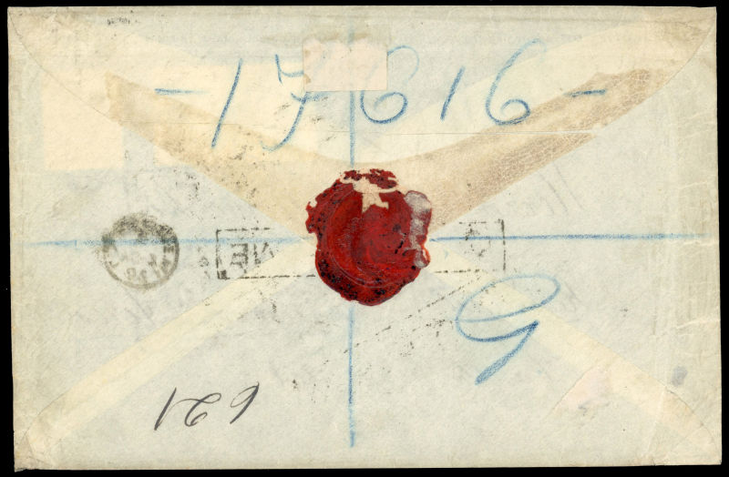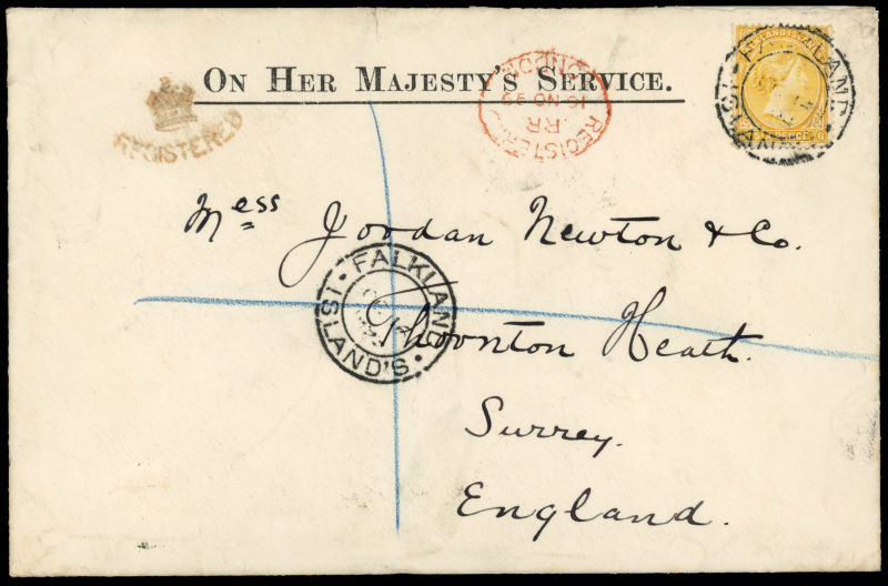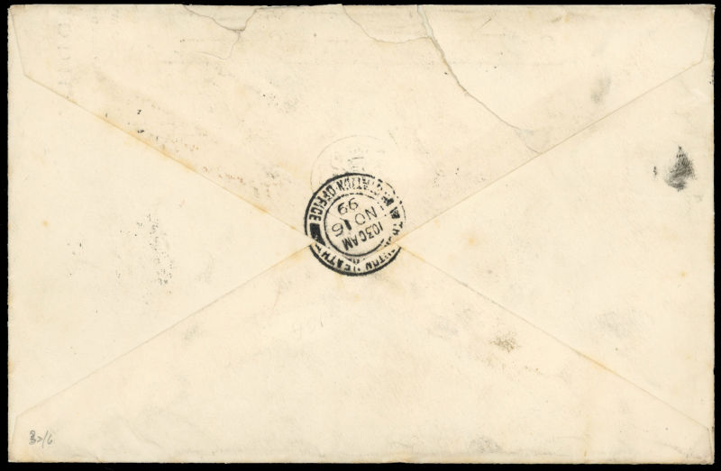 355   image1899 (OC 16) printed OHMS cover (embossed royal arms on flap) to UK, franked by 1891-1902 6d yellow, (Quadruple rate, 2d registration + 4d postage) tied by type F3 cds, with another very fine strike at centre, with ‘(Crown)/REGISTERED; hs at upper left exceptionally struck in RED, London transit mark (16 NO 99) at top in red, with Thornton Heath arrival cds (NO 16) on flap. A lovely commercial usage with a rare solo franking, the scarce type F3 cds and the highly unusual red strike of the registration mark. Superb! SG 34 (Image) (Image2) (All Images)