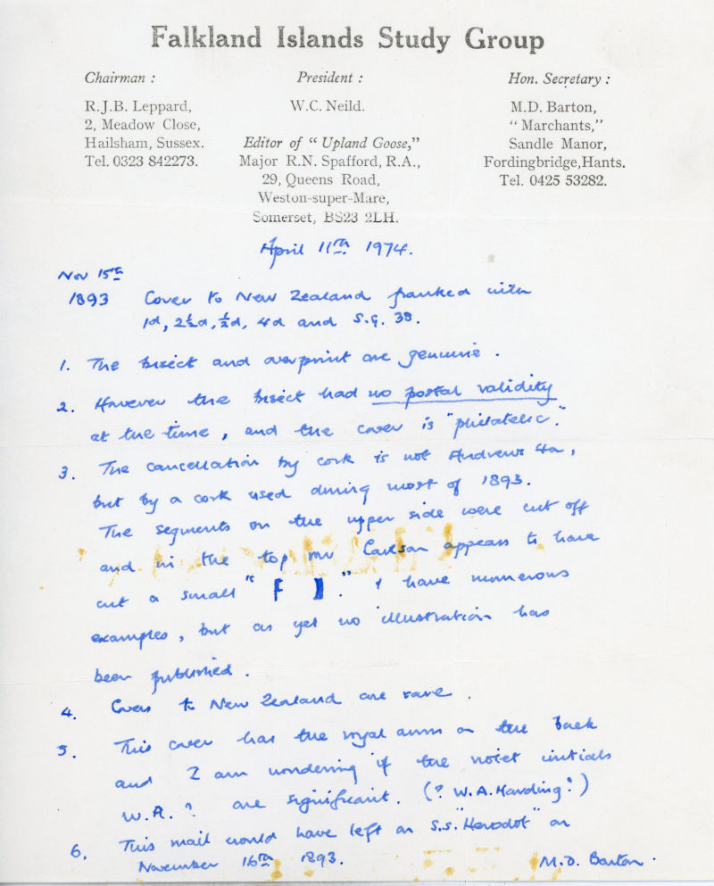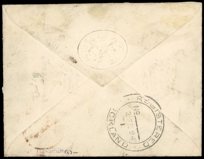 347   image1893 registered envelope to Auckland bearing ½d green, 1d reddish chestnut, 2½d dull blue, 4d olive grey-black and ½d on half 1d red-brown (posthumous strike), tied by clear cork cancels (late state of Barnes 3/93?).  NO 15 despatch CDS below, crown/ REGISTERED at lower left and London transit on front.  The reverse with embossed Royal Arms on backflap and Auckland arrival of 2 FE 94.  Philatelic, still an attractive cover to a rare destination, with detailed 1974 letter from Malcolm Barton (Image) (Image2) (Image3) (All Images)