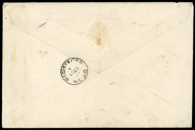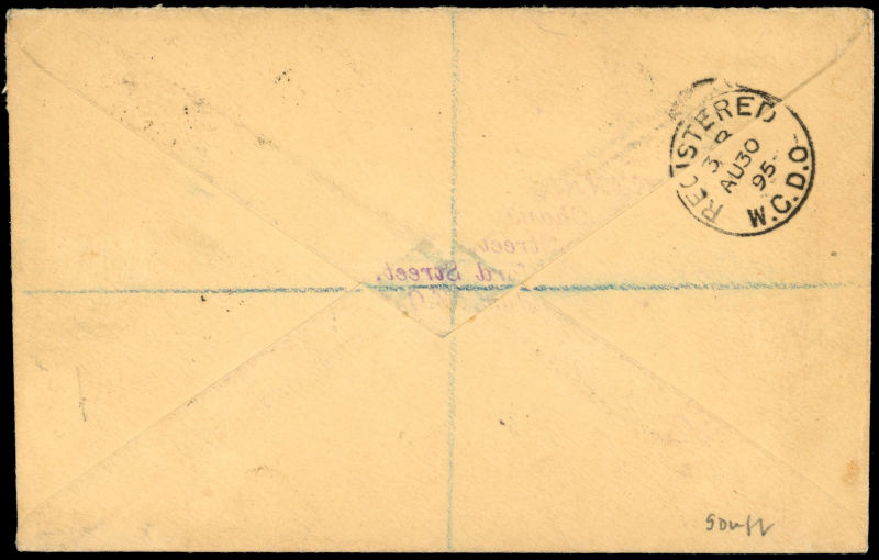 348   image1895 (JU 25) registered cover to London franked by the six values then in issue, comprising 1878-79 1s bistre-brown no watermark and 1891-1902 ½d green (1892 printing), 1d claret (1894 printing), 2½d dull blue (a lovely deep shade from the Nov 1891 printing), 4d olive-black (May 1895 printing, which had arrived the day before!) and 6d orange-yellow (Nov 1891 printing) tied by three fine strikes of type F1 cds with ‘(crown)/registered’ hs and London arrival ds (30 AU 95) below with further arrival cds on reverse. A wonderful six-colour franking of considerable interest, bearing what is likely to be the earliest known usage of the 4d olive-black. SG 4, 16/33x (Image) (Image2) (All Images)