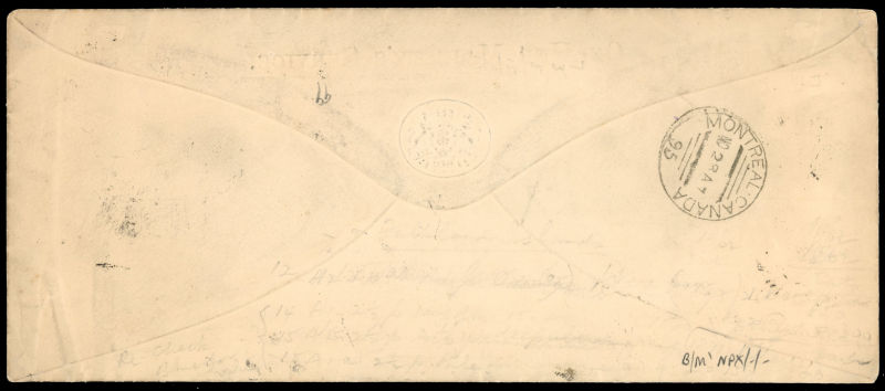 350   image1895 registered OHMS envelope to Canada, bearing 1891-1902 1d claret (oxidised) and 2½d ultramarine vertical pairs, tied by ‘F.I.’ obliterators with two strikes of the ‘Crown / REGISTERED’ h/s at left, London registered oval (20 Nov) alongside and backstamped with Montral arrival cds (NO 28); minor edge wrinkling still a fine and rare double rate cover. (Image) (Image2) (All Images)