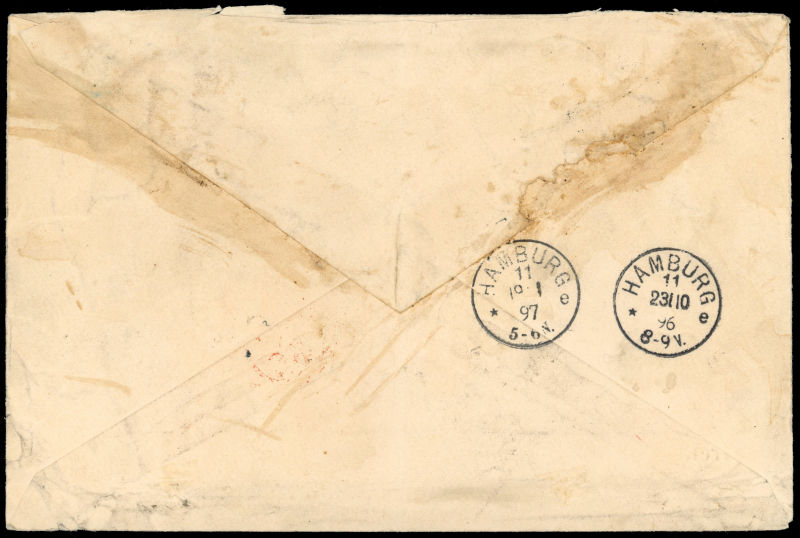 351   image1896 (SP 14) registered ‘Buckup’ cover to Hamburg bearing 1891-1902 set of 8 to 1s, tied by type F2 cds (which also ties the edges of the 9d and 4d values)  the other four values tied by four fine strikes of cork cancel (Barnes 1/96 ‘Buckup’) and blue crayon line. ‘(Crown)/REGISTERED’ below with 2x London arrival hs dated ‘22 OCT 96' and ‘18 JAN 97’ alongside, reverse showing 2x Hamburg receiving hs dated 23/10/96 and 19/1/97. A very interesting cover which travelled the route twice, presumably leaving the Falklands first time with only the cds applied and the other stamps uncancelled, the cover then sent back with the request to cancel the other stamps when the cork and registration crayon was applied. Minor faults- vertical crease and some soiling and flap damage on reverse, nevertheless a highly unusual and attractive cover. SG 17/38 (Image) (Image2) (All Images)