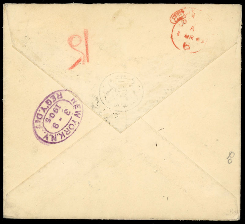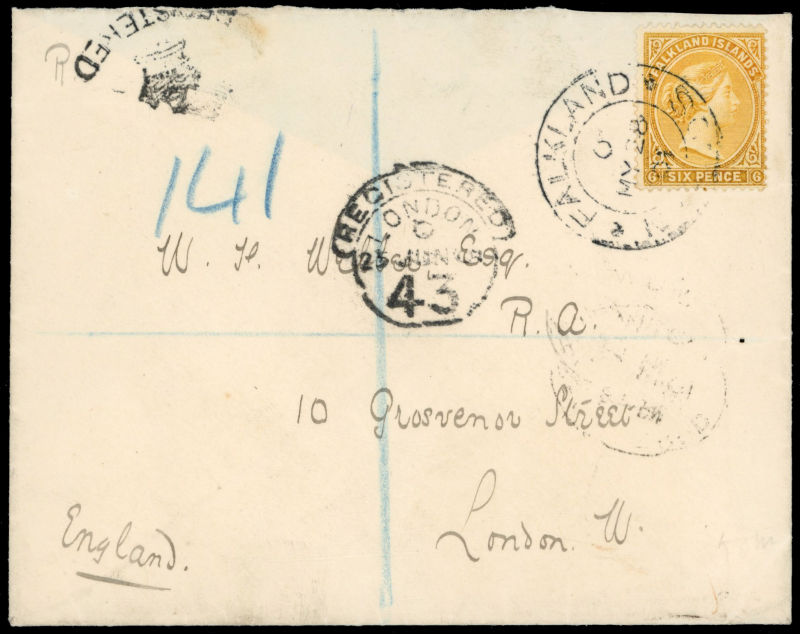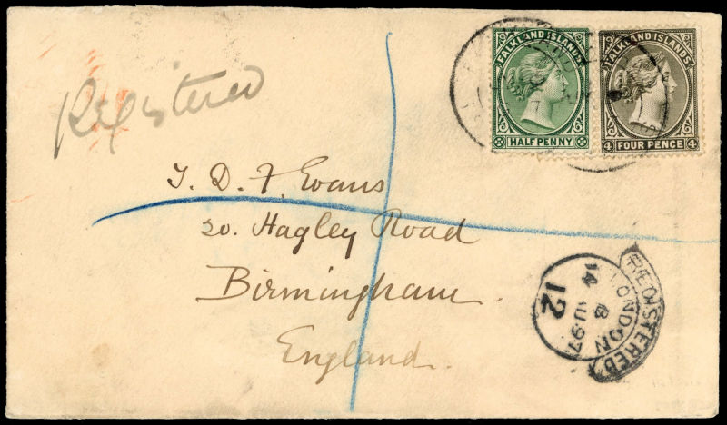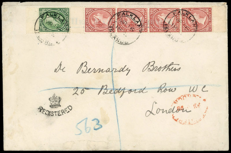 360   image1905 (FE 2) Registered cover to New York, franked at 4½d rate (2½d postage plus 2d registration) by 1891-1902 2d pale purple and 2½d ultramarine, tied by strike of type F4 ‘FALKLAND ISLANDS’ cds with ‘(crown)/REGISTERED’ hs below. London (1 MR) and New York (9 MR) backstamps. Minor marks incl on 2d, still a neat and scarce cover. SG 25, 30 (Image) (Image2) (All Images)