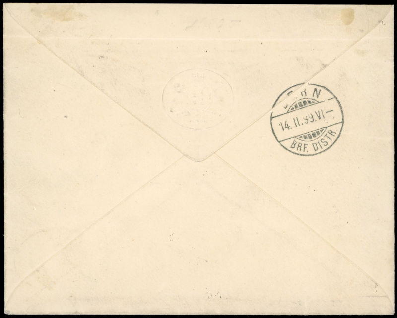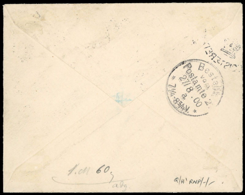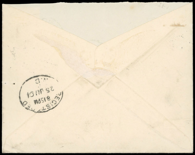 356   image1900 rather pretty registered envelope to Berlin, bearing ½d yellow-green, 1d pale red, 2d reddish purple and 2½d ultramarine, each with JU 25 Type F4A CDS.  Crown/ REGISTERED handstamp at upper left, and German ‘Vom Auslande’ registered label applied in transit.  Arrival backstamp 27/8.00 (Image) (Image2) (All Images)