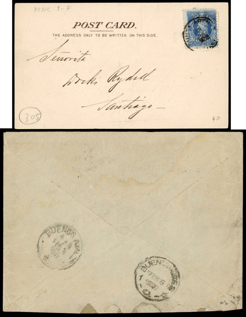 358   image1902 envelope to Buenos Aires, bearing ½d yellow-green, 1d pale red, 2½d deep ultramarine, 4d olive-black and 6d yellow, Type F4A CDSs of FE 4.  Arrival backstamps FE 9.  Carried on PSNC RMS ‘Orissa’, en route from Callao to Liverpool, a coloured ppc of which vessel is included (used in 1905 from Punta Arenas to Santiago).  Minor cover faults, nonetheless attractive.  SG 17b/34 (Image) (Image2) (All Images)