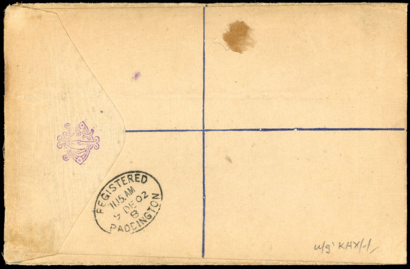 359   image1902 (NO 11) blue/buff formula registered envelope (Perkins type A2) franked at double rate (2d postage plus 2d registration) by 1891-1902 4d olive-black, tied by type F4b cds and used to London. Fine ‘(Crown)/Registered’ and red arrival hs (9 DE) on face, with Paddington backstamp the same day. Minor toning and imperfections, still a fine and rare commercial usage. SG 32 (Image) (Image2) (All Images)