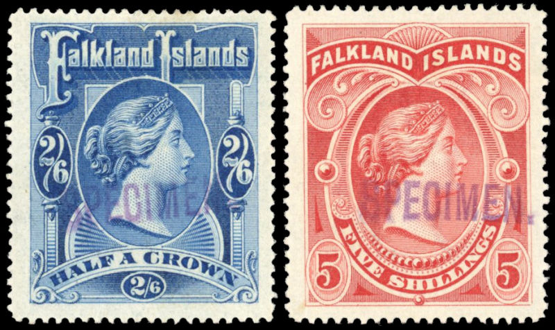 2s6d deep blue and 5s red, each with local SPECIMEN handstamp in violet (Samuel type F13), large part o.g. Minor gum creasing as often, not affecting very fine appearance. Much rarer than the UPU overprints. SG 41s-2s (Image) (Image2)
