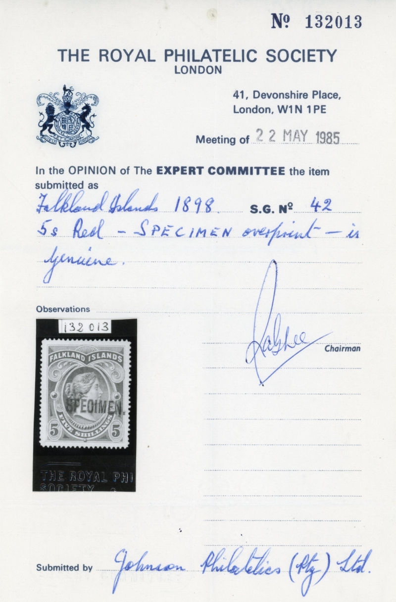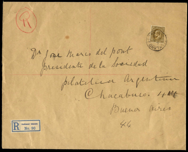 missing stamp, tied to a large official registered cover (Royal Arms on flap) to Buenos Aires by type F4C cds dated ‘AU 5 10’ with blue ‘Falkland Islands’ registration label at lower left. The cover (which must be extremely rare as a commercial solo