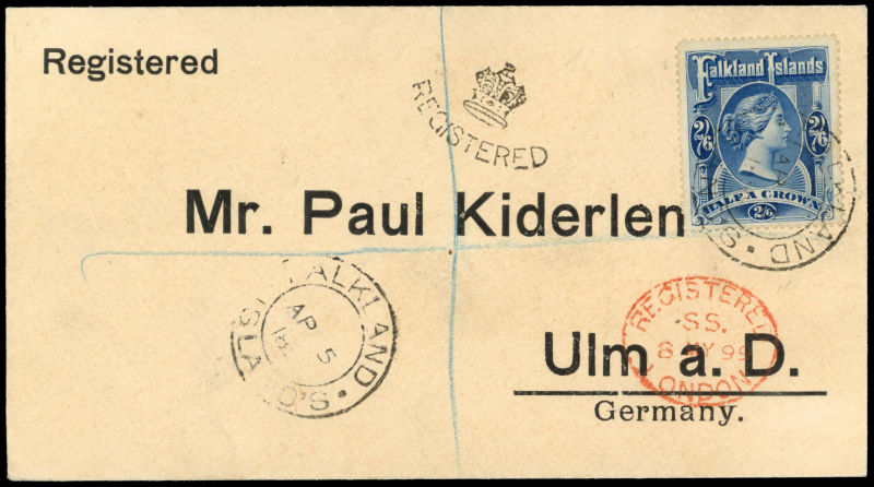 (AP 5) registered ‘Kiderlen’ cover to Germany with 1898 2s6d deep blue, tied by type F3 cds, with another strike at lower left, and showing '(Crown) REGISTERED' and red London transit ds (8 MY) on face, and Ulm arrival ds on reverse (9.V.99). Stamp