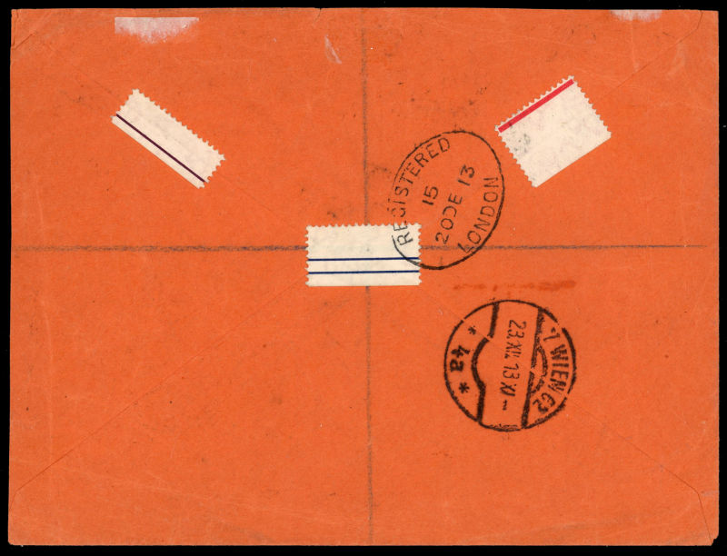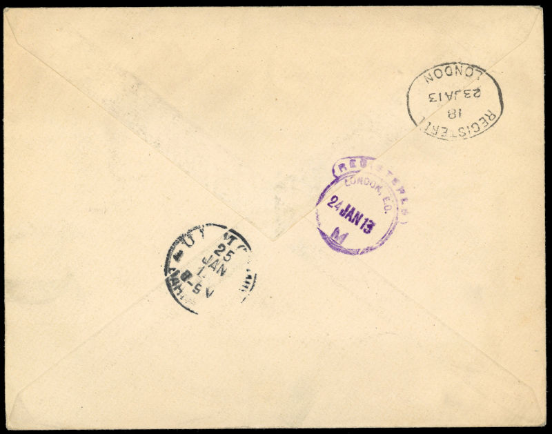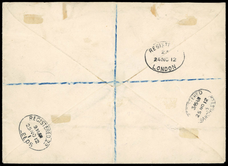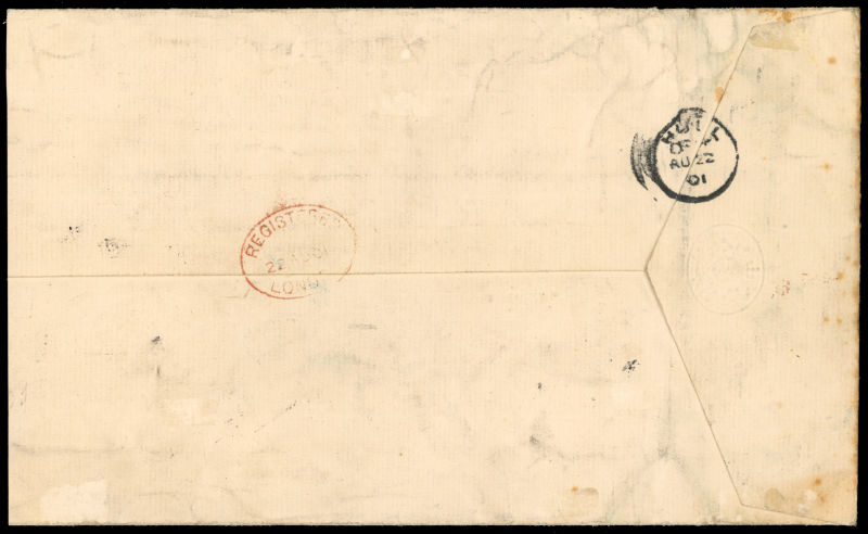 and red oval London transit (22 AU 01) alongside, with London and Hull arrival backstamps (both 22 AU). Endorsed in pencil under stamp ‘Under 5½ oz’ which would have required 11d postage + 2d registration but this is undoubtedly a commercial usage,