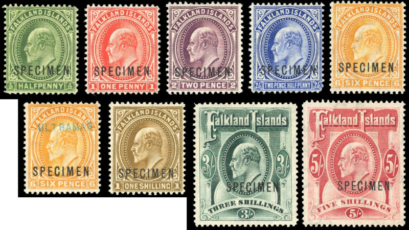 1904-12 set of 8 to 5s overprinted SPECIMEN, fresh and fine large part o.g. with additional unused 6d opt ‘ULTRAMAR’ for distribution to Portuguese colonies. A very fine set with exceptionally fresh colours and highly desirable in this