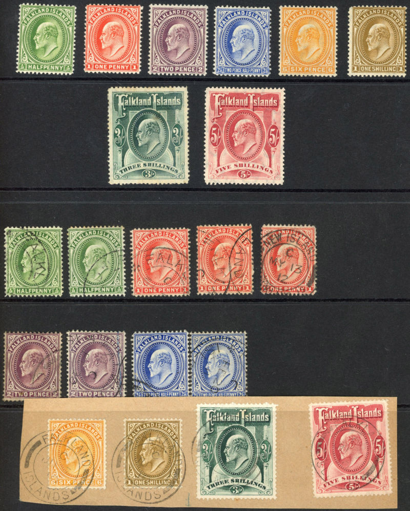 1904-12 KEVII range including basic set of 8 mint and used (6d, 1s, 3s, 5s tied to piece), ½d and 1d unmounted mint blocks of 4, 1d coppery red strip of 3 used, and 1s block of 4 used, condition varies but much is fine. SG 43/50, cat