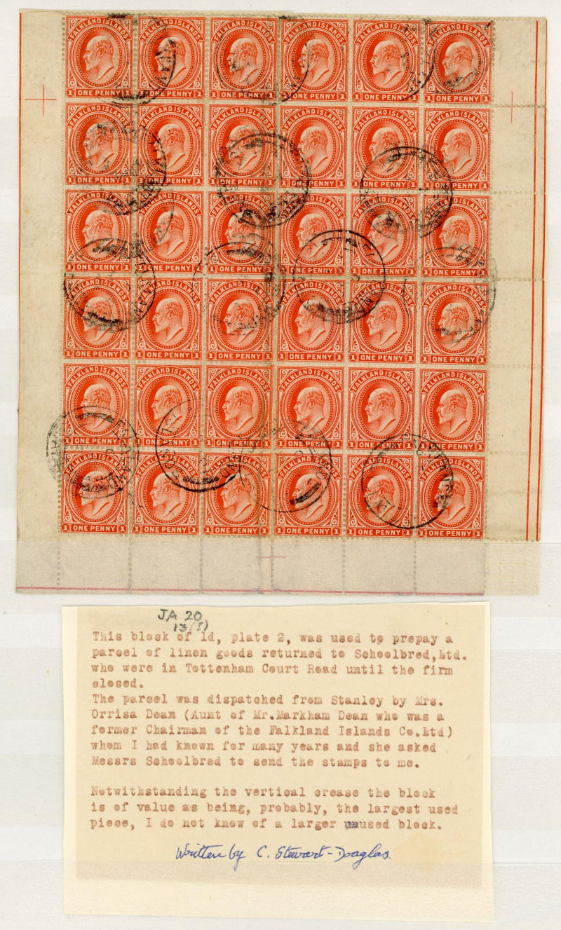 1d orange-vermilion lower six rows of sheet used, some faults as to be expected with a block of this size; vertical crease, splitting and reinforced, lower right piece of selvedge missing. A remarkable multiple, surely the largest used block known.
