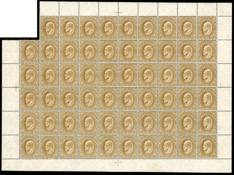 1904-12 KEVII 1s brown, complete sheet lacking the upper left corner stamp, brilliant fresh o.g. (trace of hinge on one stamp only), Only 255 sheets printed and a remarkable item in its own right, but much enhanced by the presence of the