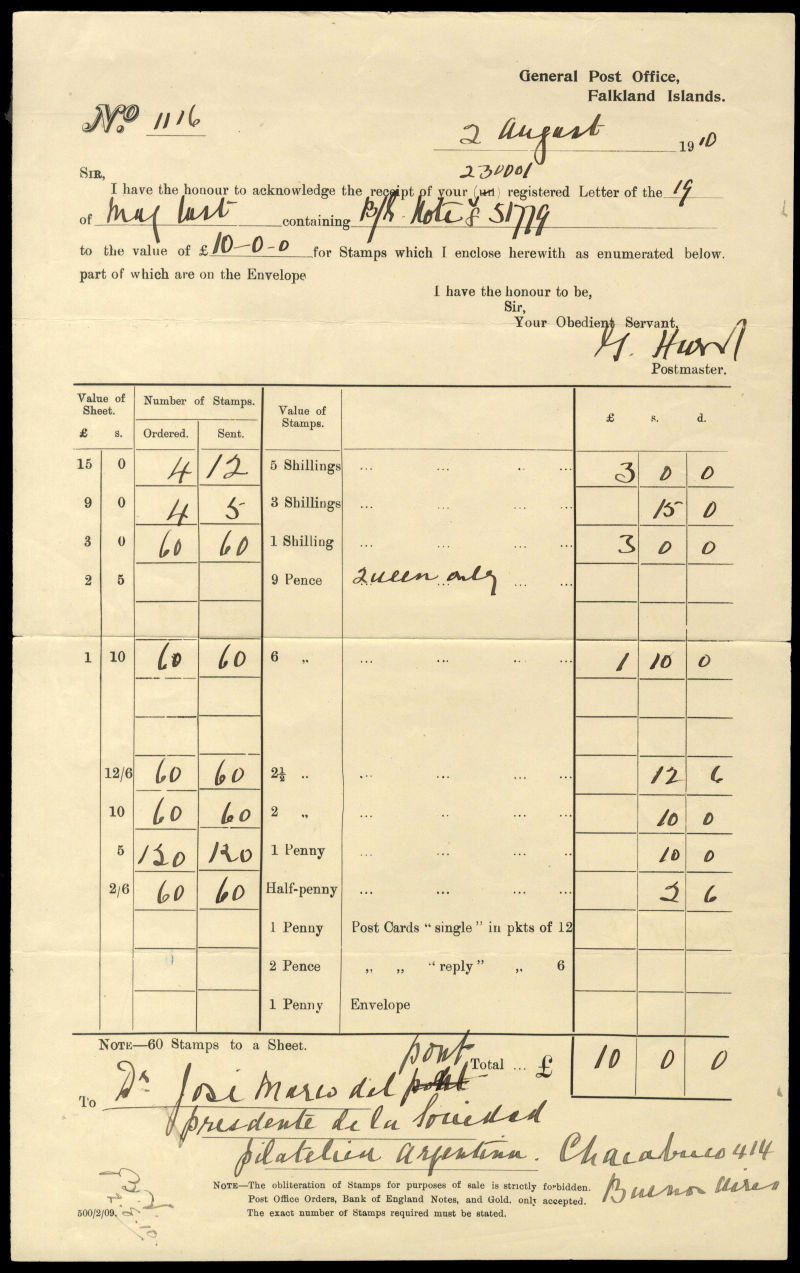 franking of 1s paying quadruple rate + 2d registration), addressed to the President of the Argentine Philatelic Society contained this and other sheets, making up a £10 order (original invoice enclosed!) The official form, dated 2/8/10, begins ‘….