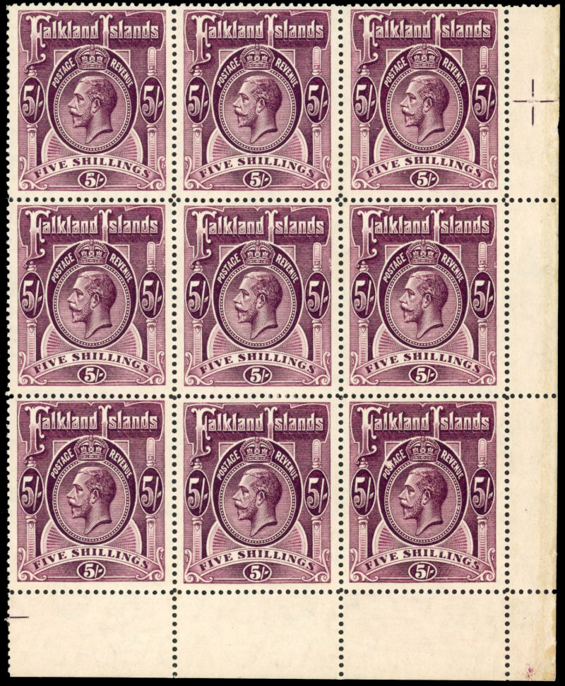 1912-20 5s maroon, lower right corner block of 9, brilliant o.g. (unmounted, but three three stamps with tiny adhesions). A lovely and very rare positional multiple, showing guide cross in right margin. SG 67b cat £1,260++ (Image)
