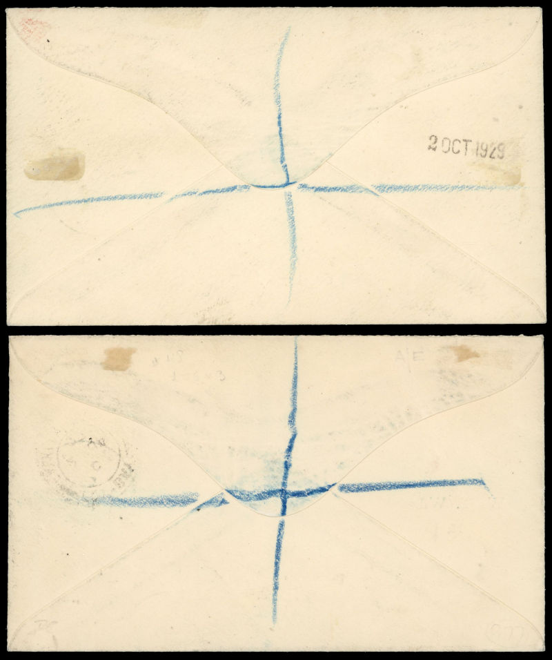 pair of registered ‘Wilson’ covers bearing 3s slate-green and 10s red on green paper, each cancelled at Fox Bay, respectively on 3 JA and JY 14. Neat. SG 66, 68
