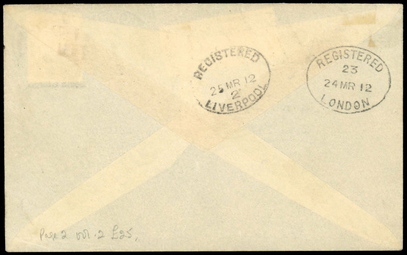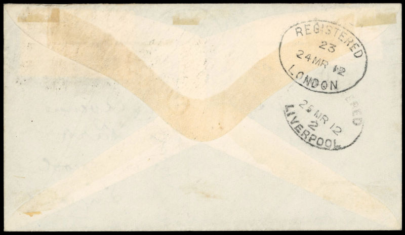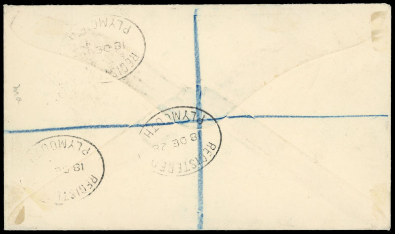 2½d deep steel-blue and 2½d purple on yellow paper; evidently uncancelled at South Georgia and postmarked in transit by Liverpool registered datestamps of 19 DE, backstamped Plymouth transit of 18 DE. Unusual (Image) (Image2)