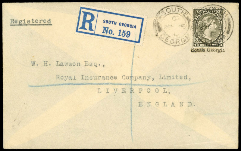 (FE 5) registered ‘Lawson’ cover from South Georgia to Liverpool franked by Falkland Islands 1891-1902 4d olive-black, tied by fine strike of type SG1 cds (and another alongside) and by ‘South Georgia’ underprint, with ‘South Georgia’ Registration
