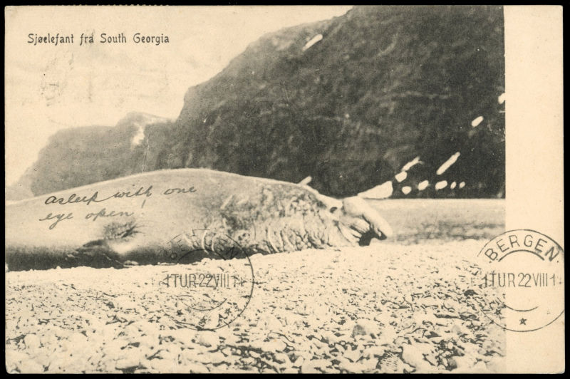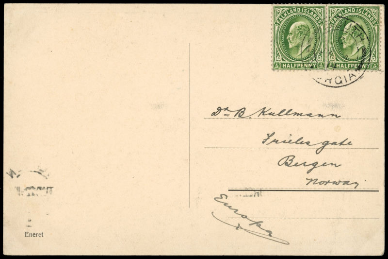 South Georgia. 1914 picture postcard (Elephant Seal, legend in Norwegian). Bears two KE VII ½ds (correct rate), tied by South Georgia CDS of JY 4 14, addressed to Norway. Unusual usage (Image) (Image2)