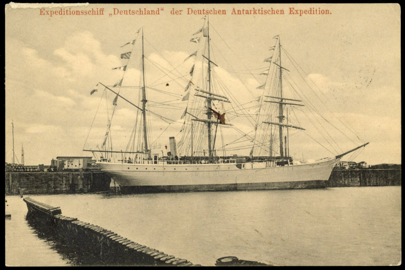(DE 16) German South Polar expedition picture postcard depicting Expeditionschiff "Deutschland" addressed to Berlin, franked on reverse by Falkland Is 1904-12 1d vermilion tied by type SG1 cds, with the red perforated expedition label tied by superb