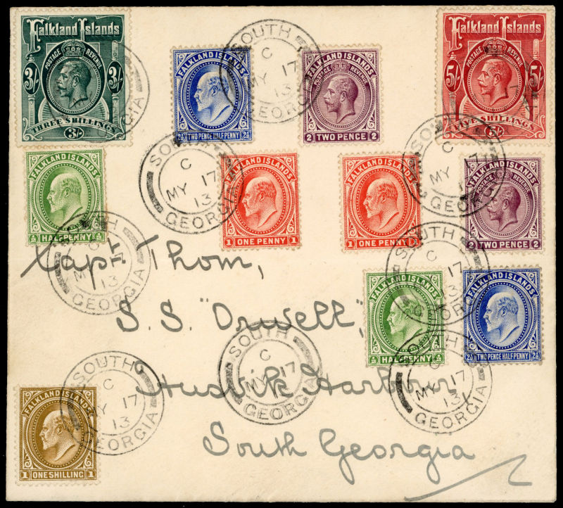 South Georgia. 1913 envelope locally addressed to a ship's captain at Husvik Harbour, a (now defunct) whaling station on South Georgia. Bears KEVII ½d, 1d and 2d x 2 each and 1s, and KGV 2d x 2, 3s and 5s, tied by nine good to very fine