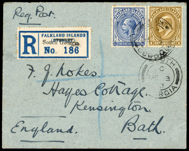 neat registered cover to Bath, bearing KEVII 1s yellow-brown and KGV 2½d deep bright blue tied by South Georgia CDS Type SG1 of DE 3 13, with a better strike below. Provisional registration label at upper left; backstamped London and Bath. Slight