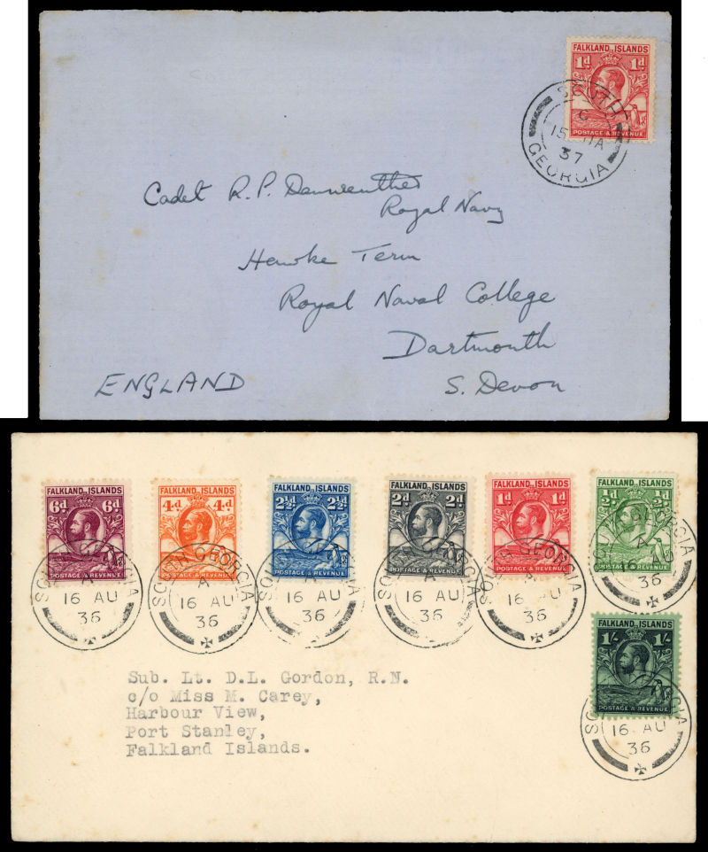 South Georgia. 1933-6 five covers. 1933 Davies cover with ½d x 2 (correct rate), and another with 1d, both 7 DE; 1½d sole franking to Wilmslow, 16 AU 36; 3d sole franking to Edinburgh, JA 18 33; and cover to Norway with 3 x 1d, 2 x 3d