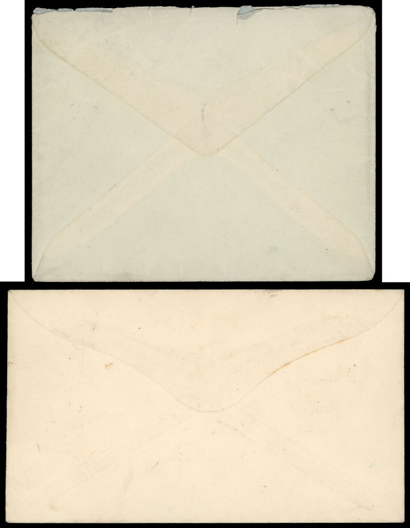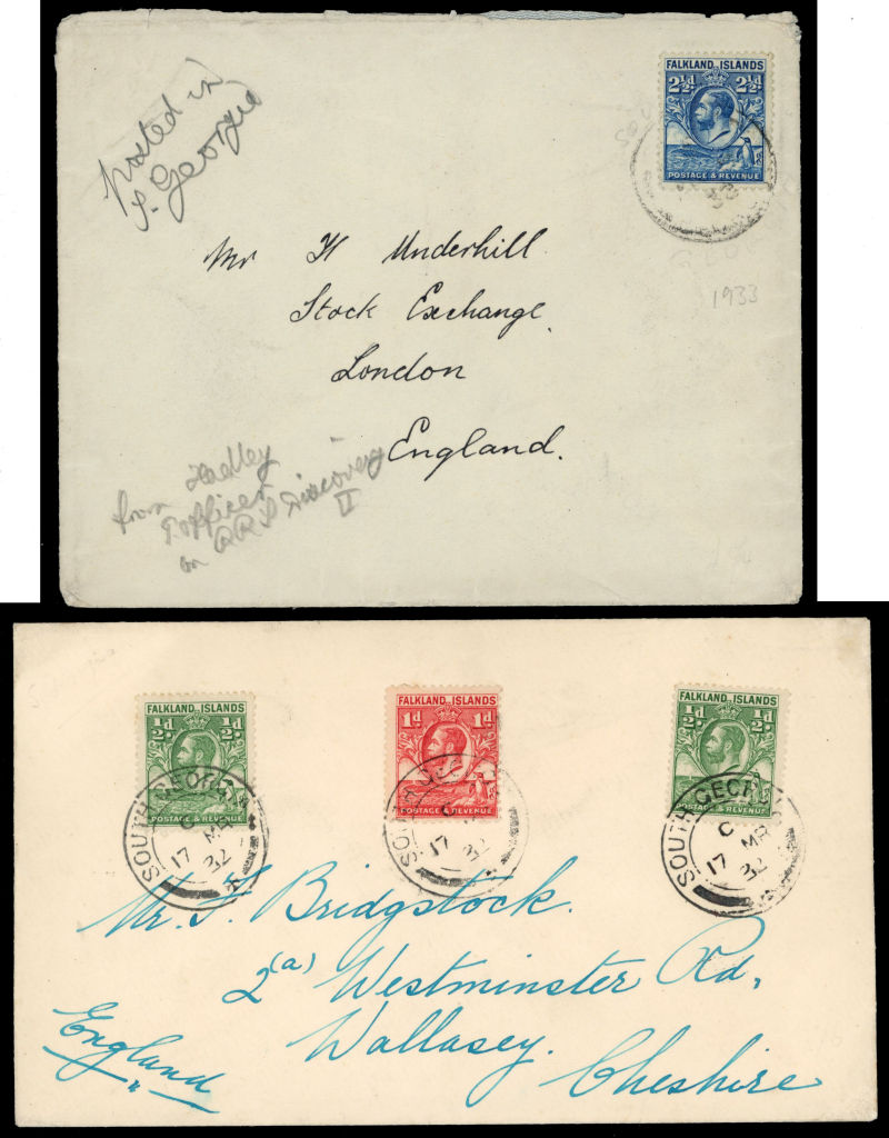 South Georgia. ‘Whale and Penguin’ frankings. 1932 cover to Cheshire bearing ½d (2) and 1d with individual strikes of 17 MR 32 CDS with distorted ‘3’ in year; 1933 envelope with 2½d, unclear CDS, pencil notes ‘posted in S. Georgia’ and