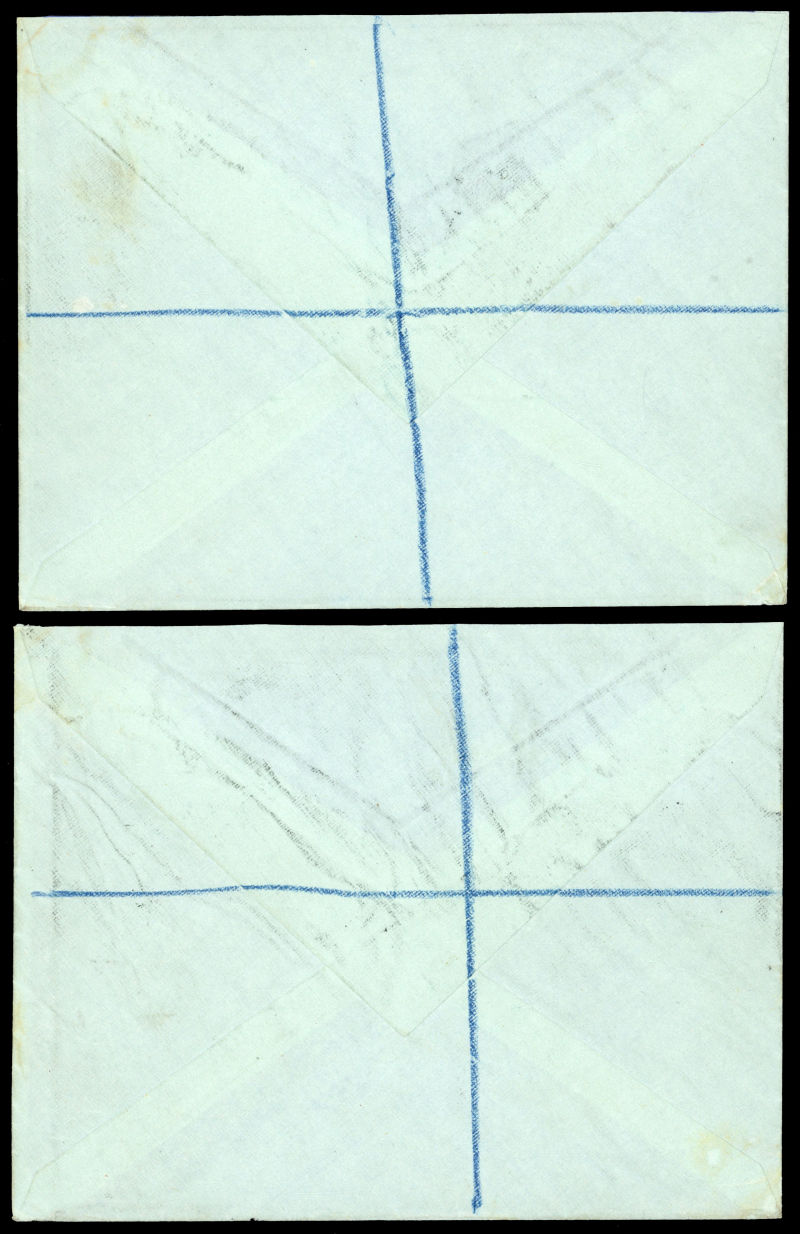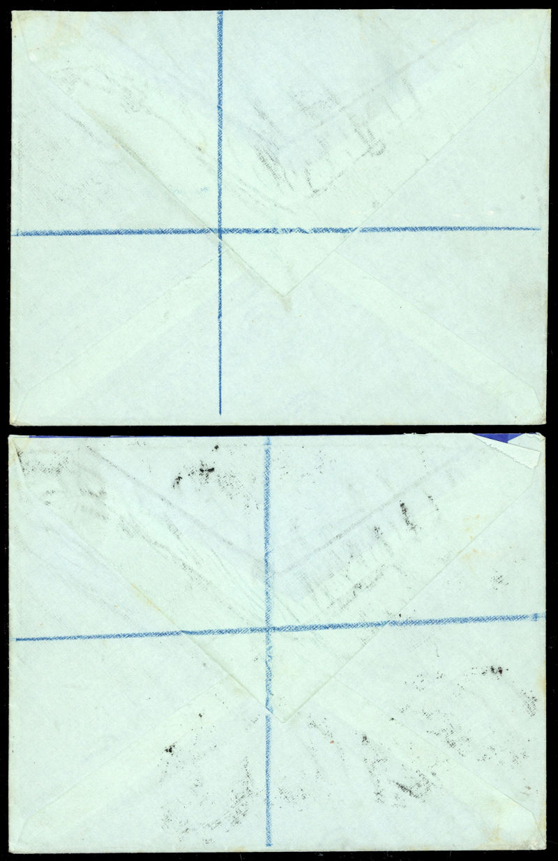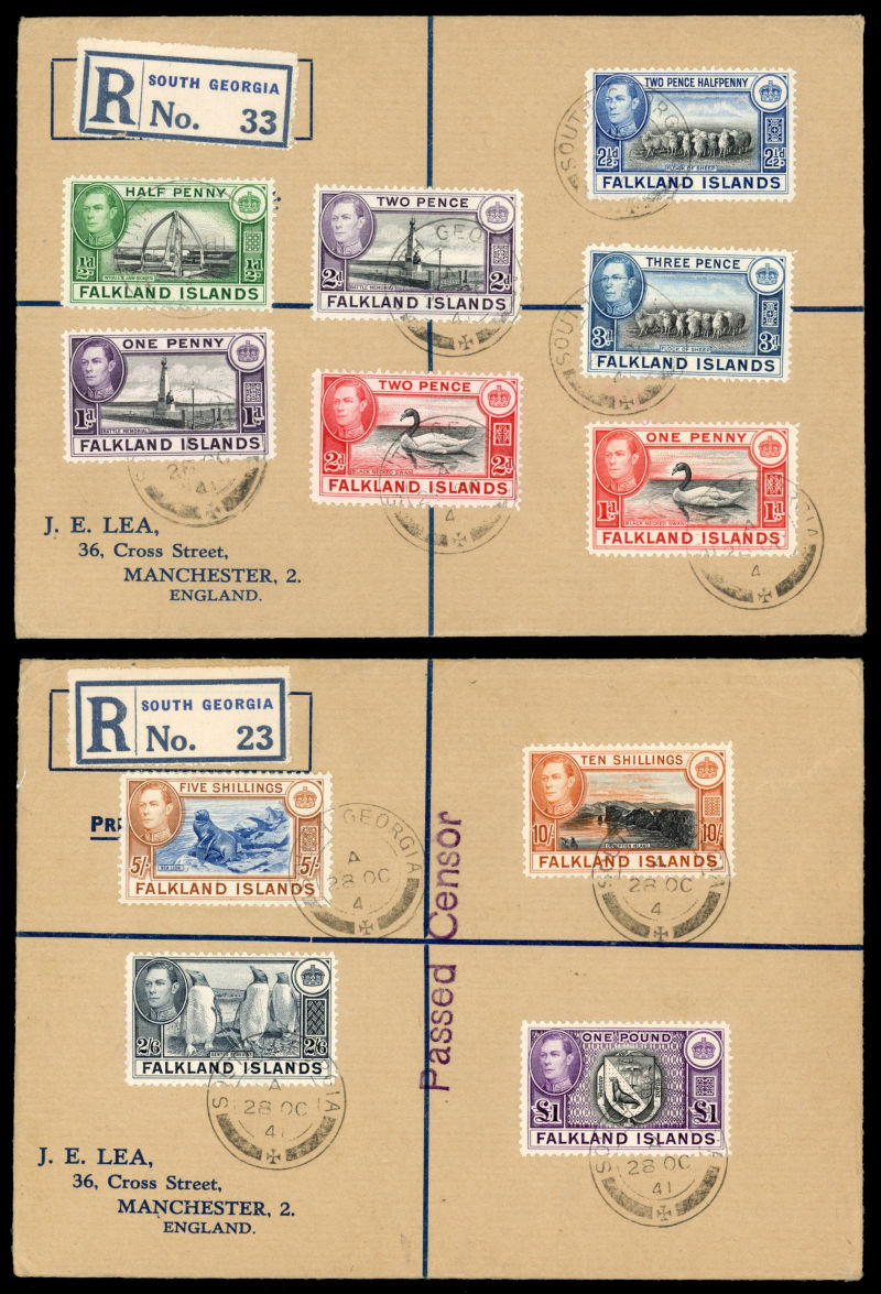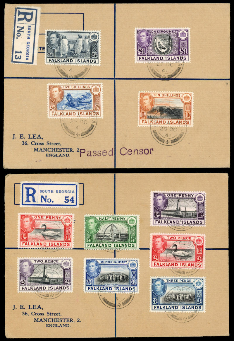J.E. Lea registered envelopes to Manchester, bearing the set as at that date (i.e. no 2½d Goose or 1s3d, but with both 1ds and 2ds), 28 OC 41 South Georgia CDSs. The low value cover with ½d to 3d on the front and 4d to 1s on reverse, which has