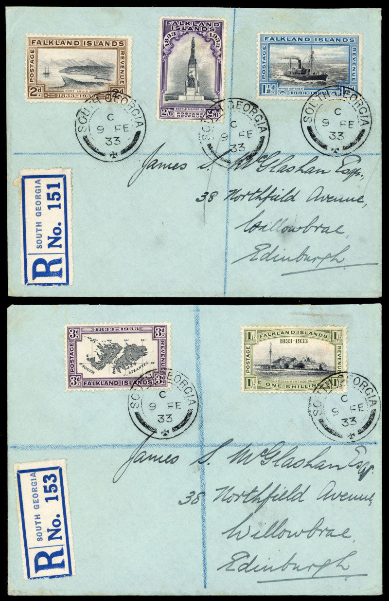 South Georgia. 1933 Centenary set to 5s used on four registered envelopes to Edinburgh, South Georgia CDSs (Type SG2) of 9 FE 33, just a little soiling (not affecting the envelope with the 5s), hardly detracting from this attractive