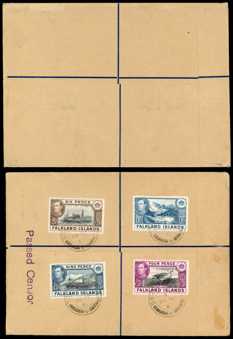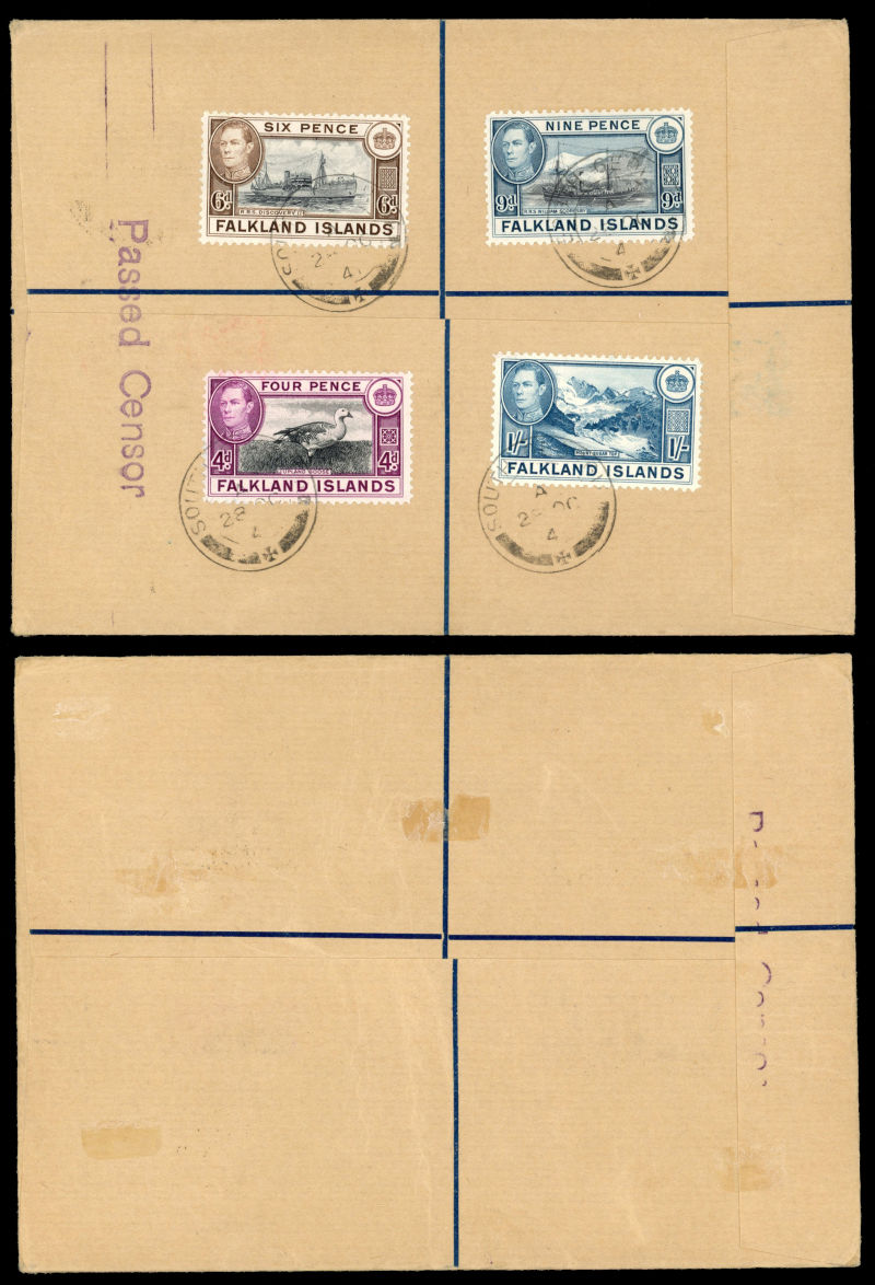 “Passed Censor” handstamp in violet (applied at South Georgia); the high value cover with 2s6d to £1 on the front, which also has the censor handstamp. The 5s and 10s are from the first printing, i.e. SG Z86 and 87. SG Z73/88, £862 as individual