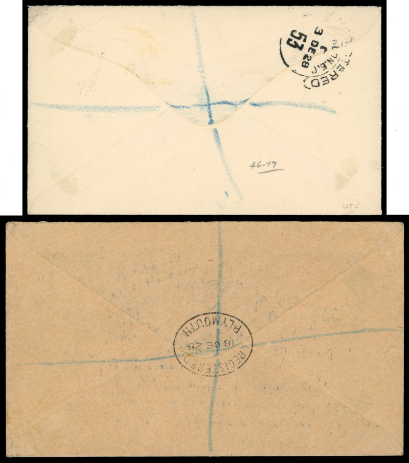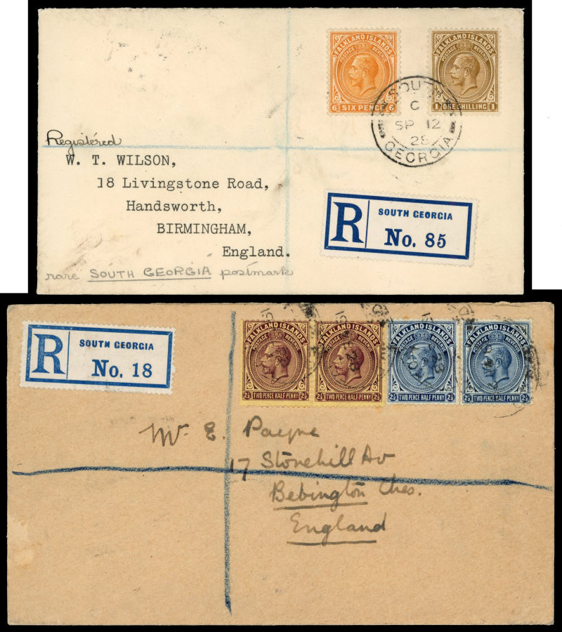 South Georgia. 1928 registered ‘Wilson’ envelope bearing 6d and 1s, tied by single strike of code C CDS of SP 12, London transit on reverse; and another 1928 envelope with South Georgia registered label, bearing horizontal pairs of the