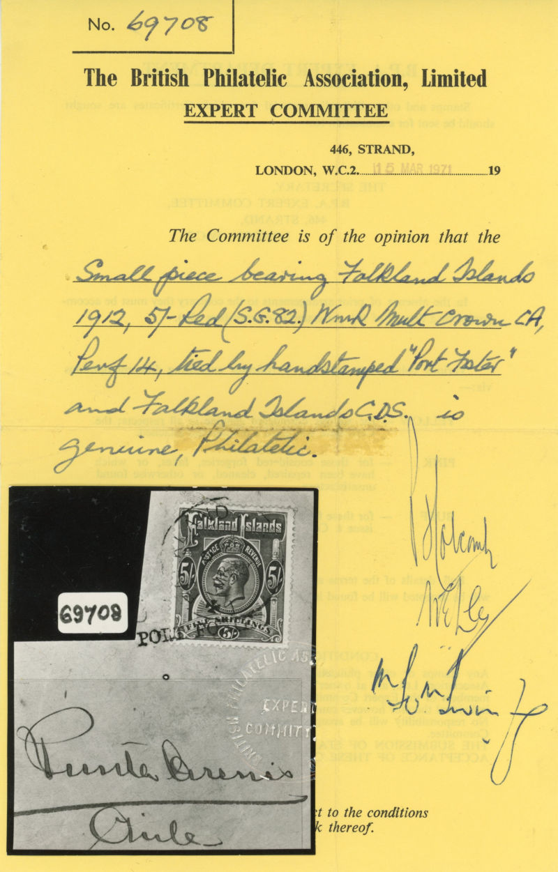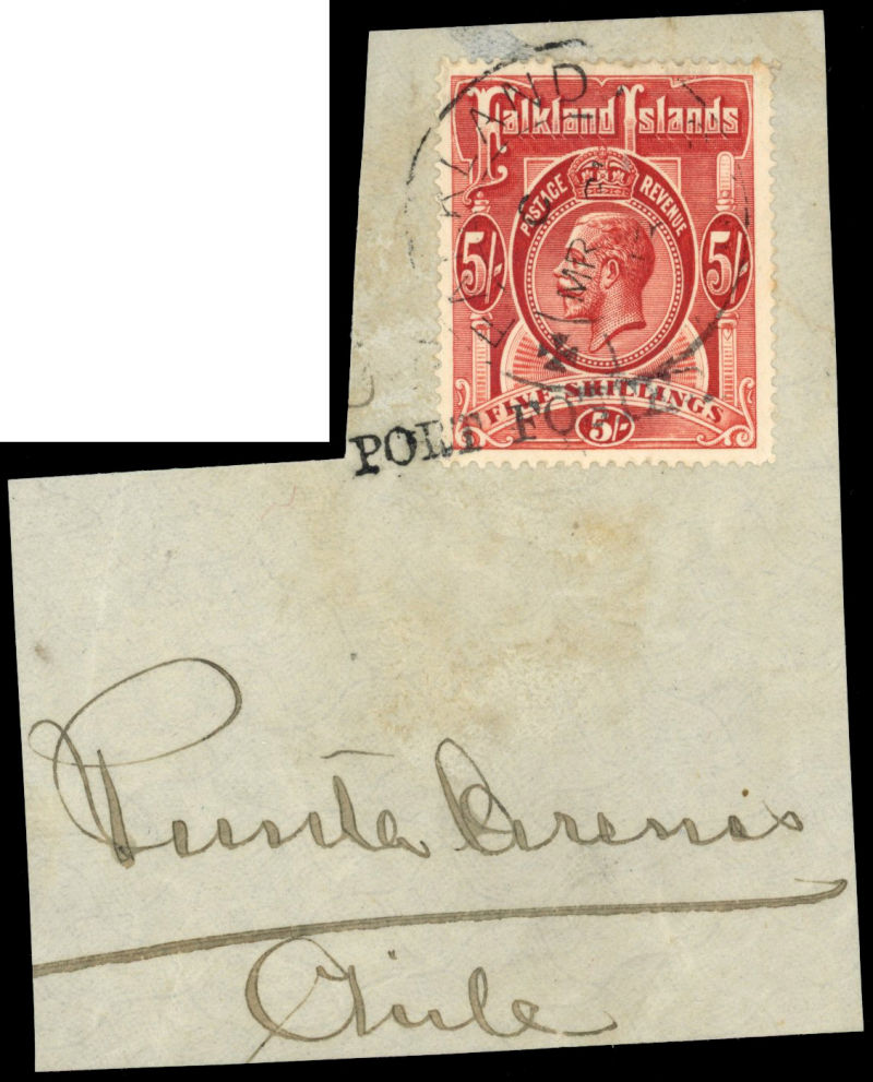 piece addressed to Punta Arenas, Chile, with Falkland Is 1912-20 5s deep rose-red (lifted and hinged in place) tied by fine complete strike of ‘PORT FOSTER’ straight-line handstamp (Deception Island, South Shetlands) and by ‘FALKLAND/ISLANDS’ type