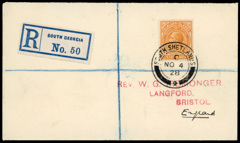 South Shetlands. 1928 ‘Iremonger’ registered envelope bearing 6d yellow-orange, South Shetlands Type B2 CDS of NO 4 28. South Georgia registration label. Plymouth backstamps. Neat. SG Z146 (Image) (Image2)