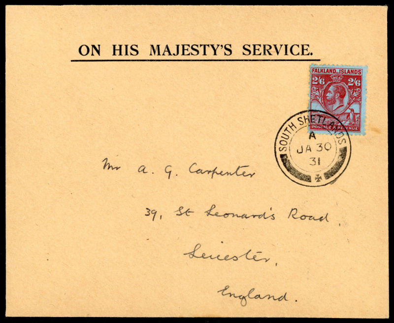 OHMS envelope to Leicester, bearing 2s6d Whale and Penguin tied by very fine South Shetlands CDS Type B2 of JA 30 31. SG Z155 (Image) (Image2)