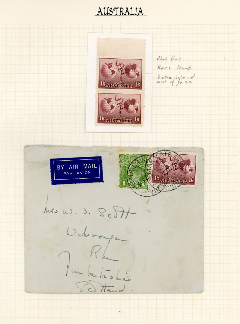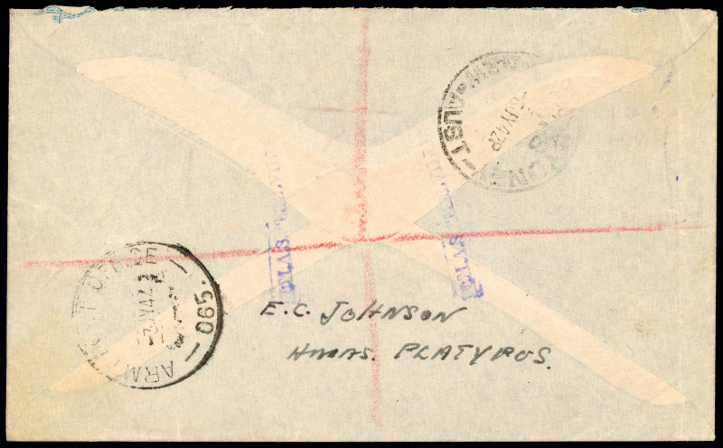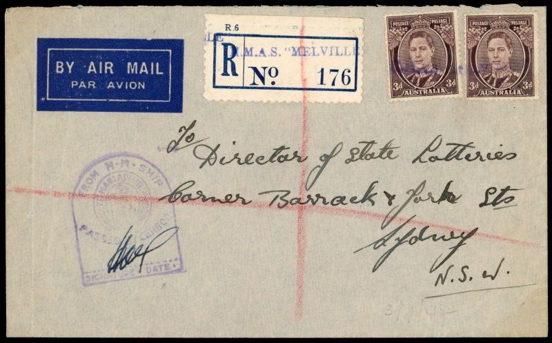 registered airmail envelope to Sydney with two 3ds, cancelled solely by straight-line H.M.A.S. Melville in violet, another strike on registered label, and two strikes across the backflap. Sender on reverse, “E.C. Johnson HMAS Platypus”. Tombstone