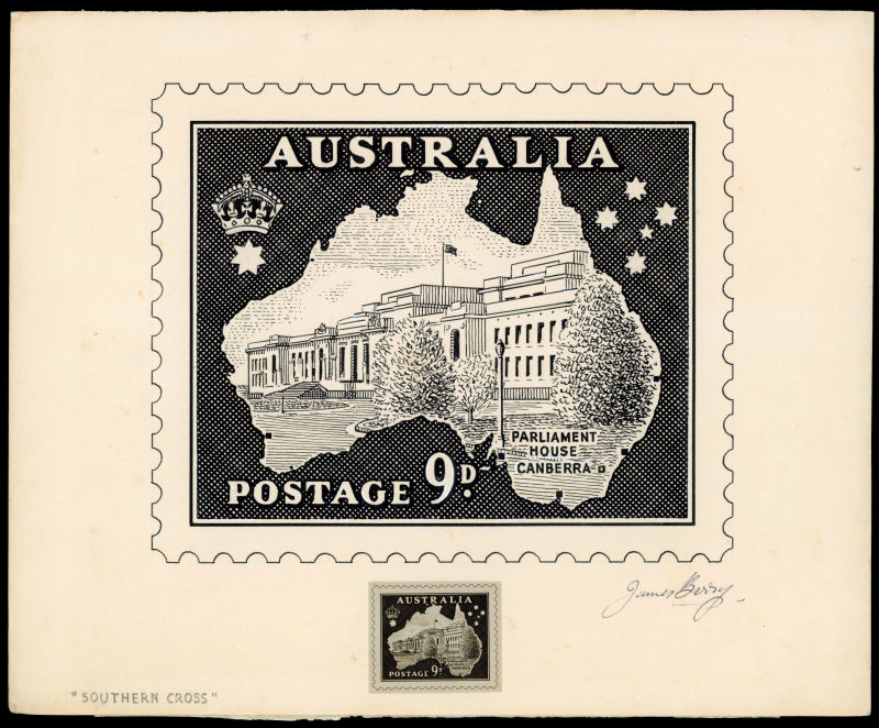 places, approx. 174mm x 143mm, by the prolific New Zealand stamp designer James Berry and signed below design, also endorsed "SOUTHERN CROSS" in pencil at lower left, a photographic 'stamp size' reproduction has been affixed below the design,