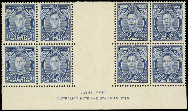 blue Die I Ash imprint block of eight unmounted o.g., lightly folded up the gutter. One small, faint foxed spot, still fine. SG 168, £520, ASC $900 (Image)