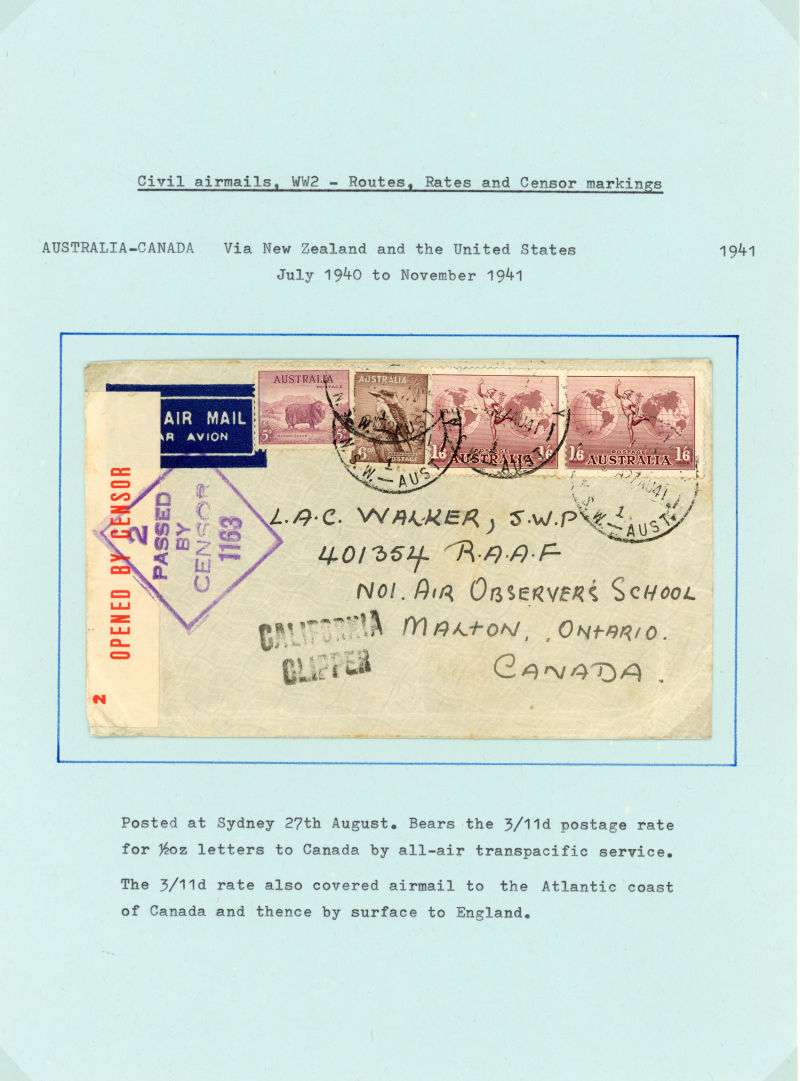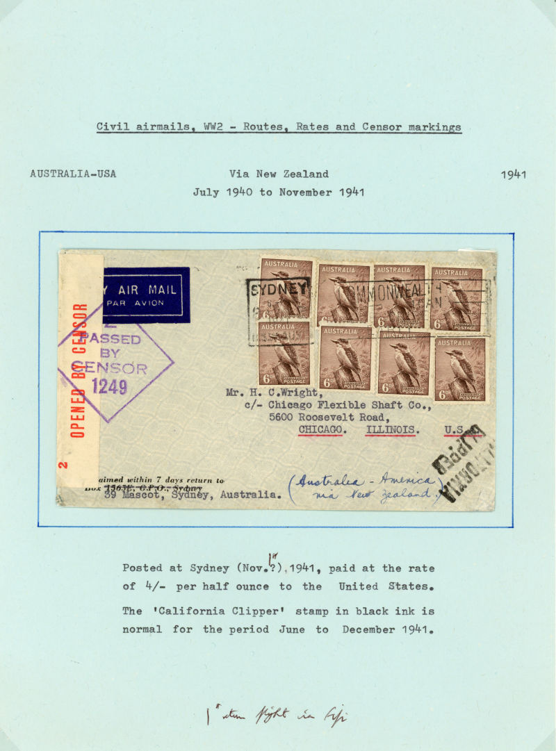 History. 1941 trio of covers with CALIFORNIA CLIPPER handstamps in black or violet. One to Chicago at 4/- rate with purple diamond censor 1249, this via the short-lived Fiji route; one to Ontario at 3/11d, purple diamond censor 1163; one to UK by