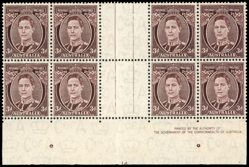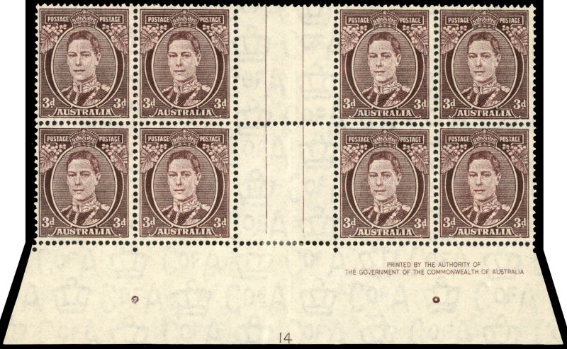 3d purple-brown interpanneau lower marginal block of eight with Plate 14 at base, large part o.g., folded up the gutter. SG 187, ASC 196zc, $600 (Image)