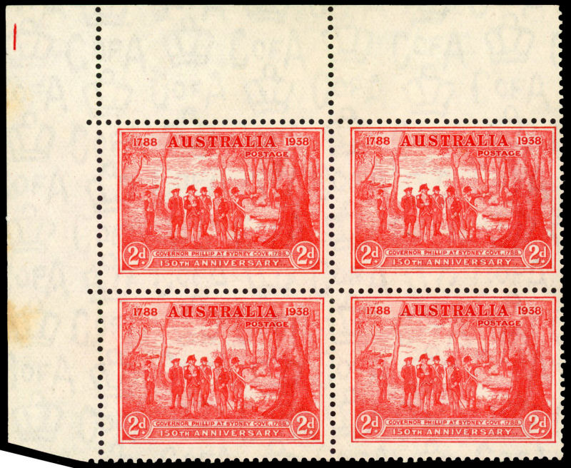 2d scarlet perf 13½ x 14 upper left corner block of four with Plate 7, unmounted o.g. Centred left, otherwise fine. SG 167, ASC 187z, $600 (Image)