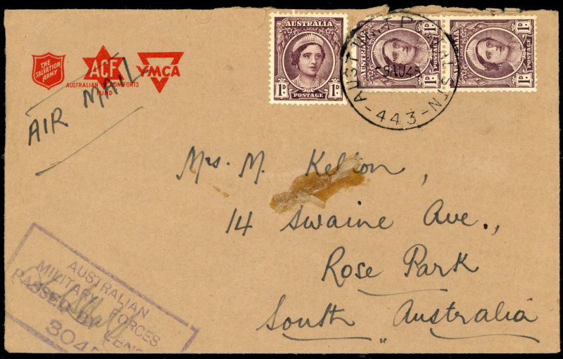 Australian Forces. 1945 envelope to Australia bearing Australia 1d (3, one with missing corner), AUST UNIT POSTAL STN 443 CDS of 9 AU. Boxed violet AUSTRALIAN MILITARY FORCES PASSED BY CENSOR 3045. Wrinkled, glue on address; scarce (Image) (Image2)