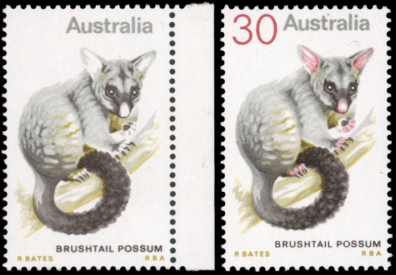 Animals 30c brush-tailed possum showing error carmine-red (face value, etc.) omitted, mint, unmounted o.g. with a tiny toned speck on reverse, otherwise fine, and offered with normal for comparison. SG 563a, £1,200; BW 662c. (Image)