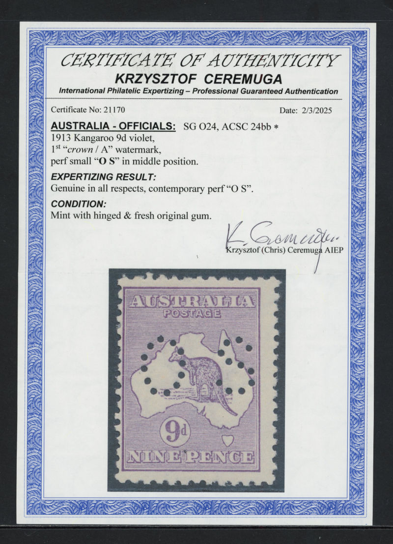 Official. 1914 9d violet, wmk 2, type O2 ‘OS’ puncture, mint large part o.g. with typical perfs and centring, scarce. Ceremuga cert (2025). SG O24, cat £325
