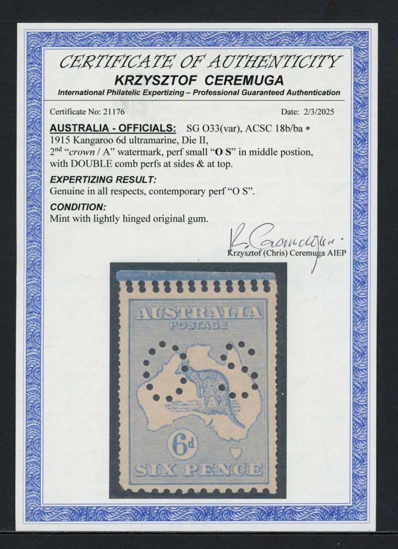 Official. 1915 6d ultramarine, wmk 5, die II, type O2 ‘OS’ puncture, upper marginal, error Double perforations on three sides, mint o.g., very scarce. Ceremuga cert (2025). SG O33 var (BW 18ba var, cat A$1250) (Image) (Image2)